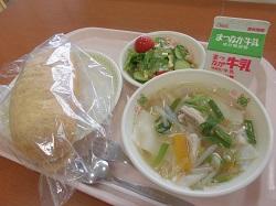 今日の献立は「きなこあげパン」「牛乳」「イタリアンサラダ(乳)」「ワンタンスープ(麦)」「ミニトマト」でした。
