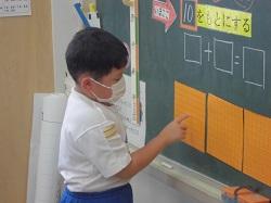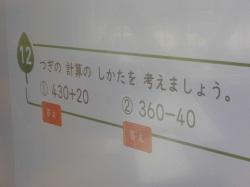 「430+20や360-40の計算の仕方を考えること」をテーマに学習していました。子どもたちは、ブロックの絵図をもとに、10のまとまりや100のまとまりから、たし算やひき算の仕方を考えていました。