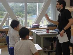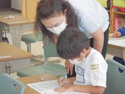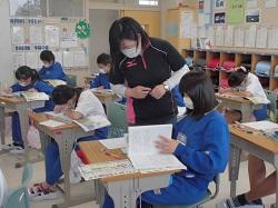 「ALTの先生が言ったことをまねてみること」をテーマに活動していました。子どもたちは、リズムやテンポが様々な「あいさつ」の表現の仕方を、よく聴いたり見たりしながらまねて、声に出して外国語にふれていました。
