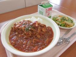 肉と野菜を煮込んだソースをごはんの上にかける「ハヤシライス」についてのお話です。今日の給食のハヤシライスには豚肉を使っています。豚肉を使うと牛肉よりあっさりとした軽い味になります。また、豚肉にはスタミナアップを助ける「ビタミンB1」が多く含まれており、そして、玉ねぎにはその「ビタミンB1」の吸収をよくしてくれる栄養素が含まれているので、豚肉と玉ねぎはスタミナアップとなる組み合わせです。味も栄養面でも相性がよい豚肉と玉ねぎが入った「ハヤシライス」を食べて元気に過ごしたいものですね。