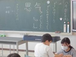 「点や画の組み立てに気を付けて書くこと」をテーマに学習していました。子どもたちは「そり」の方向や形に注意して、ていねいに練習していました。