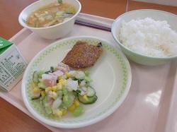 今日の献立は「ごはん」「牛乳」「さばのゴマころもやき(卵)」「わふうポテトサラダ」「とうがんのみそしる」でした。