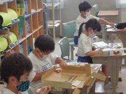 「いろいろな形の紙から思いついたことを描くこと」をテーマに活動していました。子どもたちは、準備してきた紙に自分なりに発想した絵などを表現していました。