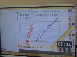 「横並びの何本かの直線(平行な関係の直線)に、1本の斜めの線をかき、どのように交わっているかを調べること」をテーマに学習していました。子どもたちは、一つ一つの角度を分度器で測定しながら関係を見つけ出していました。