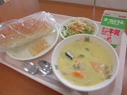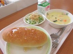 今日の献立は「コッペパン」「牛乳」「りんごジャム」「パリパリサラダ(麦)」「かぼちゃのシチュー(麦・乳)」でした。