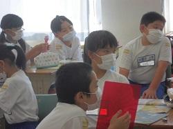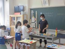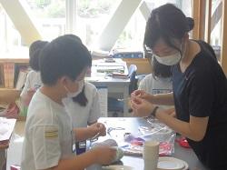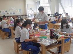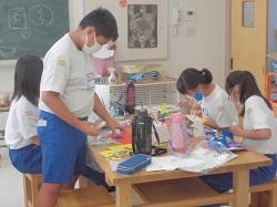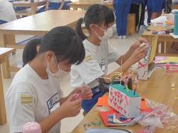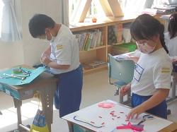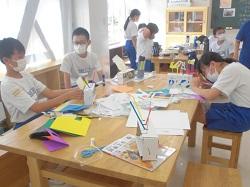 「材料をもとに発想を広げて、さらに作品づくりを進めること」をテーマに活動していました。子どもたちは、自分なりの考えを生かすとともに、友達の作品からヒントを得て作業を進めていました。