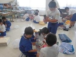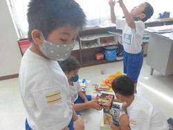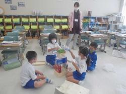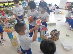 「かたちをつくったり、たかくつみあげたりすること」をテーマに活動していました。子どもたちは、持ち寄った様々な形の箱や缶を利用して、形の感覚をつかんだり、夢中になって形遊びをしたりしていました。