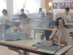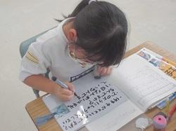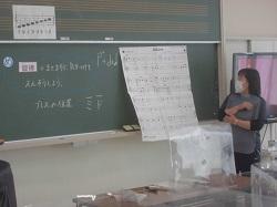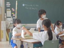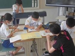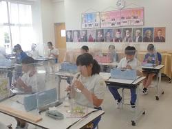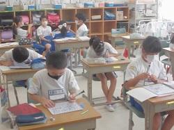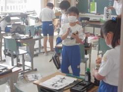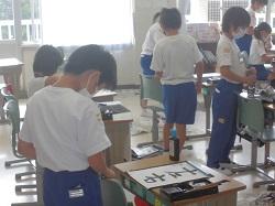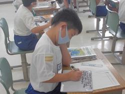 「文字の形に気を付けながら書く(毛筆)こと」をテーマに学習していました。子どもたちは、形はもちろん、画の方向や接し方等にも気を付けて書いていました。終了後の後片付けをしっかり行う姿も素敵です。