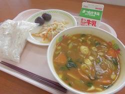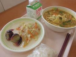 今日の献立は「カレーうどん」「牛乳」「こんにゃくサラダ」「きょほう2個」でした。