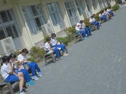 1~4年生が目的地でお弁当を食べている時間帯、学校で活動している5・6年生も時を同じくして今日は屋外で食事です。青空の下、お弁当のおいしさを味わいます。子どもたちは、できるだけ同じ方向を向きながらも、顔を見合わせたり、ほんのちょっぴり会話を楽しんだり…、楽しいひとときを過ごしていました。