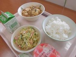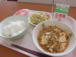 今日の献立は「ごはん」「牛乳」「マーボーとうふ」「ちゅうかサラダ(卵)」「もものジュレ」でした。