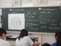 「円を組み合わせた面積を工夫して求めること」をテーマに学習していました。子どもたちは、大小それぞれの円を分けて考えたり、問題によって見方を変えたりしながら、答えを導き出していました。