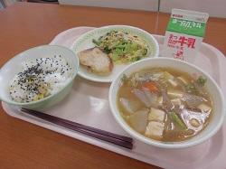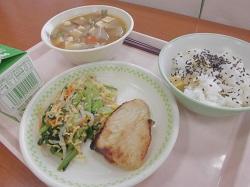 今日の献立は「くりごはん」「牛乳」「モウカザメのさいきょうやき」「こまつなのいろどりあえ(卵)」「のっぺいじる」でした。