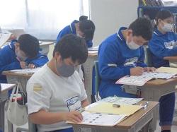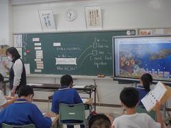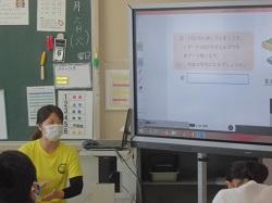 「生き物の暮らしに関するクイズを聞くこと」をテーマに学習していました。子どもたちは、ウミガメが住んでいる所や食べる生き物、ワシの体が優れている所等を聴き取り、文型に合わせて英語で回答していました。