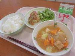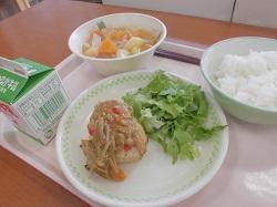 今日の献立は「ごはん」「牛乳」「とうふハンバーグ(麦)」「きのこソース」「そえレタス」「ごじる」でした。
