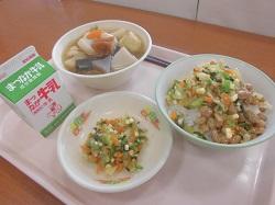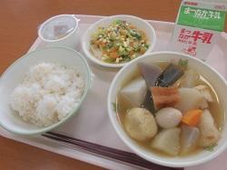 今日の献立は「むぎごはん」「牛乳」「なっとう」「セルフごもくなっとうのぐ(乳)」「おでん(卵)」でした。