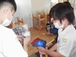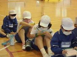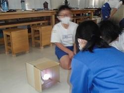 「光と場所の特徴を生かして美しい空間を作ること」をテーマに活動していました。子どもたちは、暗闇と化した図工室内で、さらに覆い(おおい)を利用しながら、光をもとにした世界を作り上げていました。