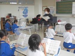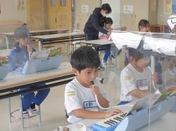 「拍にのって楽しく演奏すること」をテーマに活動していました。子どもたちは、音楽講師の先生から四部休符のとらえ方や鍵盤ハーモニカの指使い等の指導を受け、教材曲:山のポルカの演奏練習をしていました。