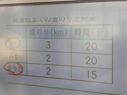 「時間も道のりも異なる時の速さの比べ方を考えること」をテーマに学習していました。「1キロメートルあたりにかかる時間」「1分あたりに進む道のり」を視点に、速さを比べていました。