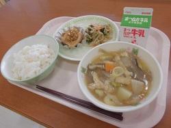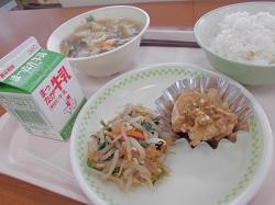 今日の献立は「むぎごはん」「牛乳」「とりにくのねぎだれかけ」「おかかあえ」「こんさいじる」でした。