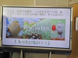 「食品ロスを少なくするために何ができるのか」をテーマに学習していました。子どもたちは、食品ロスの現状を映像の情報から知るとともに、3年生の給食の現状を振り返って、自分に合った分量を残さないように食べることの大切さを学んでいました。