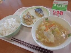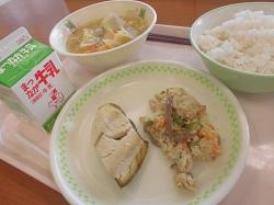 今日の献立は「むぎごはん」「牛乳」「ほっけのしおやき」「うのはないり」「みそけんちんじる」でした。