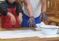 全校集会で健やか委員が手洗いの実践をし、石けんを使ってよく洗った場合と、水でさっと洗った場合を比べてみました。