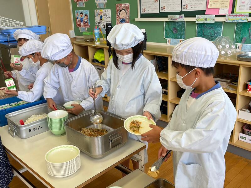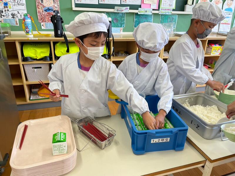 給食の時間、1、2年生も自分たちで準備をしています。立派です。楽しそう。