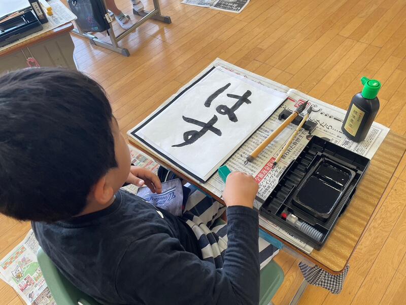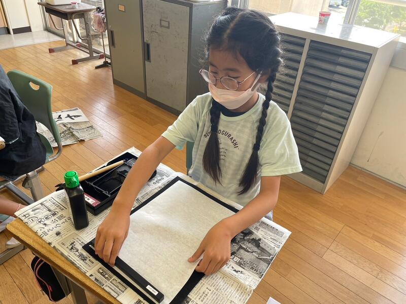 4年生、冷静な表情で、熱い思いを筆と墨にのせて。