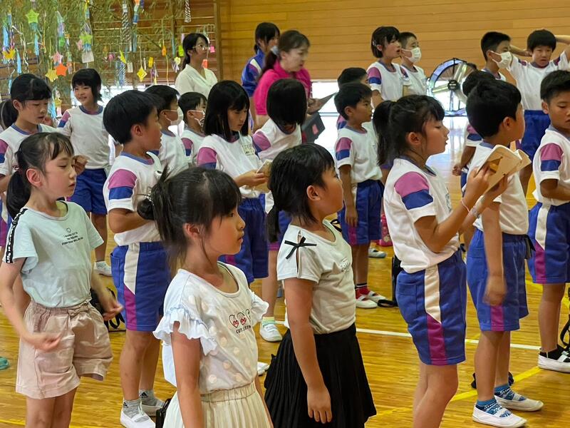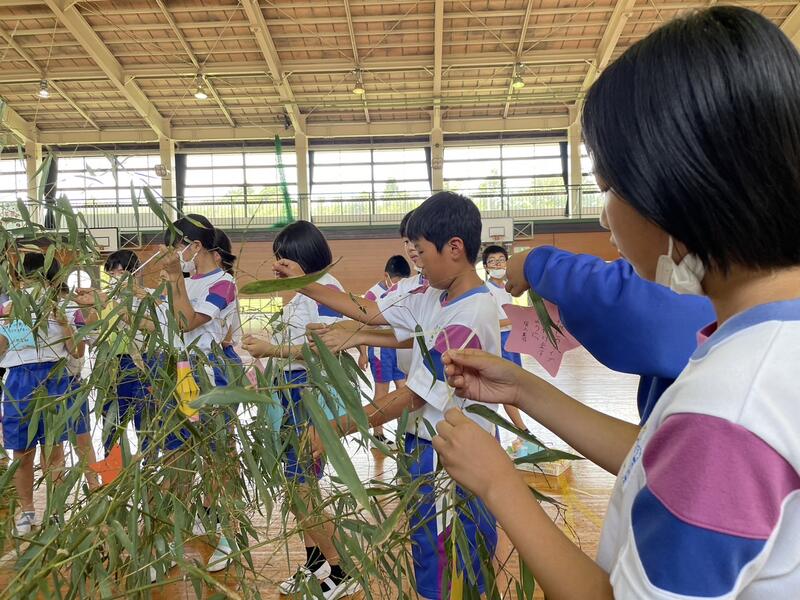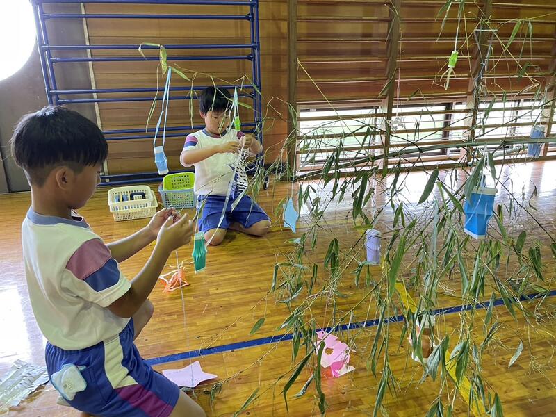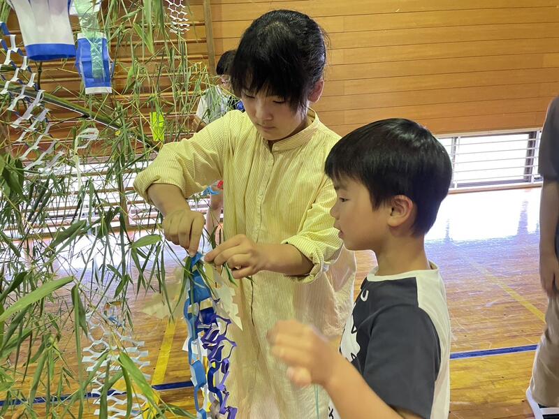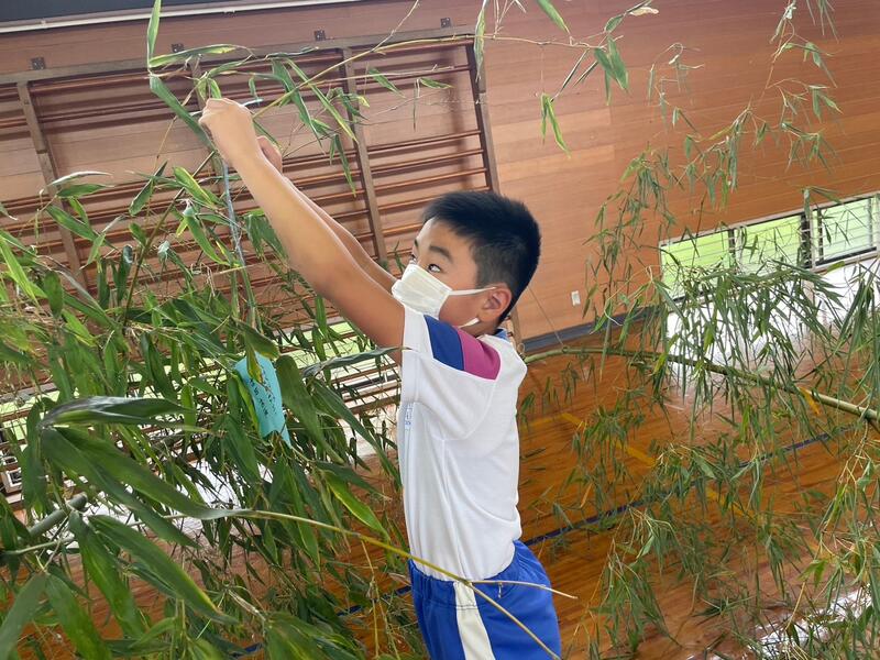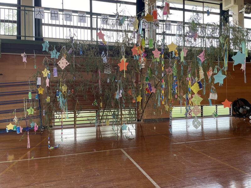 明日は七夕。太田小学校でも「七夕集会」が行われます。地域の方のご協力で本物の竹に飾り付けをする事ができました。お昼休みに、全校生で飾り付け。明日の本番は、何やら生演奏やら七夕のお話やらクイズやら…。らしいです。