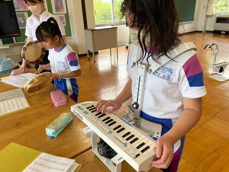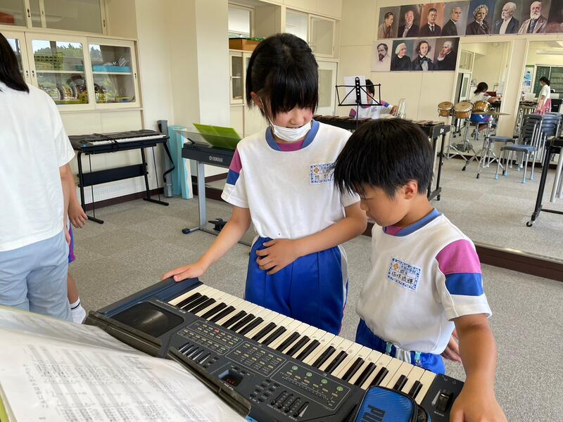 音楽祭には今年も4、5年生が出演します。初体験の4年生に、5年生がていねいに教えてあげていました。