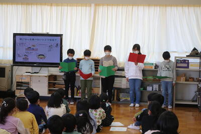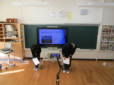 保健委員会からの発表。冬休みの健康についてクイズを交えながら,楽しく発表しました。