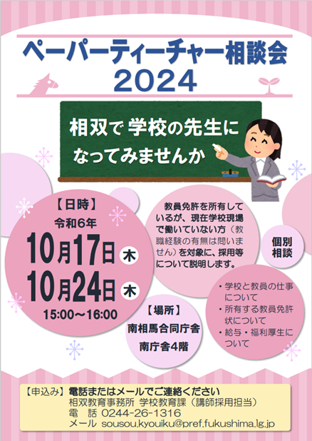 「今の学校の様子をもう少し詳しく知りたいな。」「学校で働いてみたいけど、ちょっと不安だな・・・。」教員免許をお持ちの方で、学校で働いてみたい方を対象に、南相馬合同庁舎にて相談会が行われます。ご興味のある方は、ぜひ、相双教育事務所までご連絡ください。