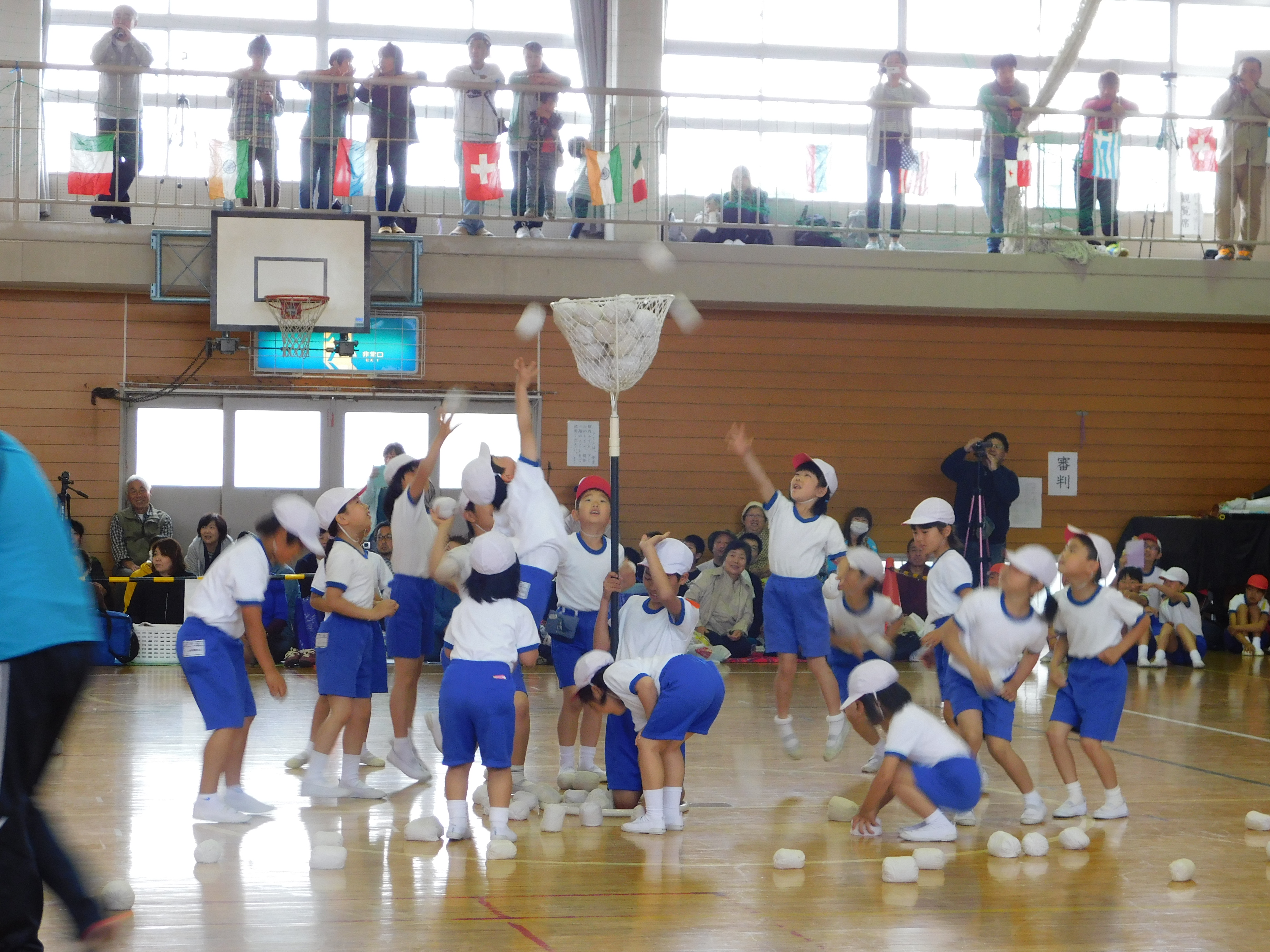 プログラム2番、1・2年生による「紅白玉入れ プラス 玉入れ」は、入れた玉の数と片付けの速さで競います。玉の数が多かったのは紅組、片付けが速かったのは白組で、勝負は引き分けでした。