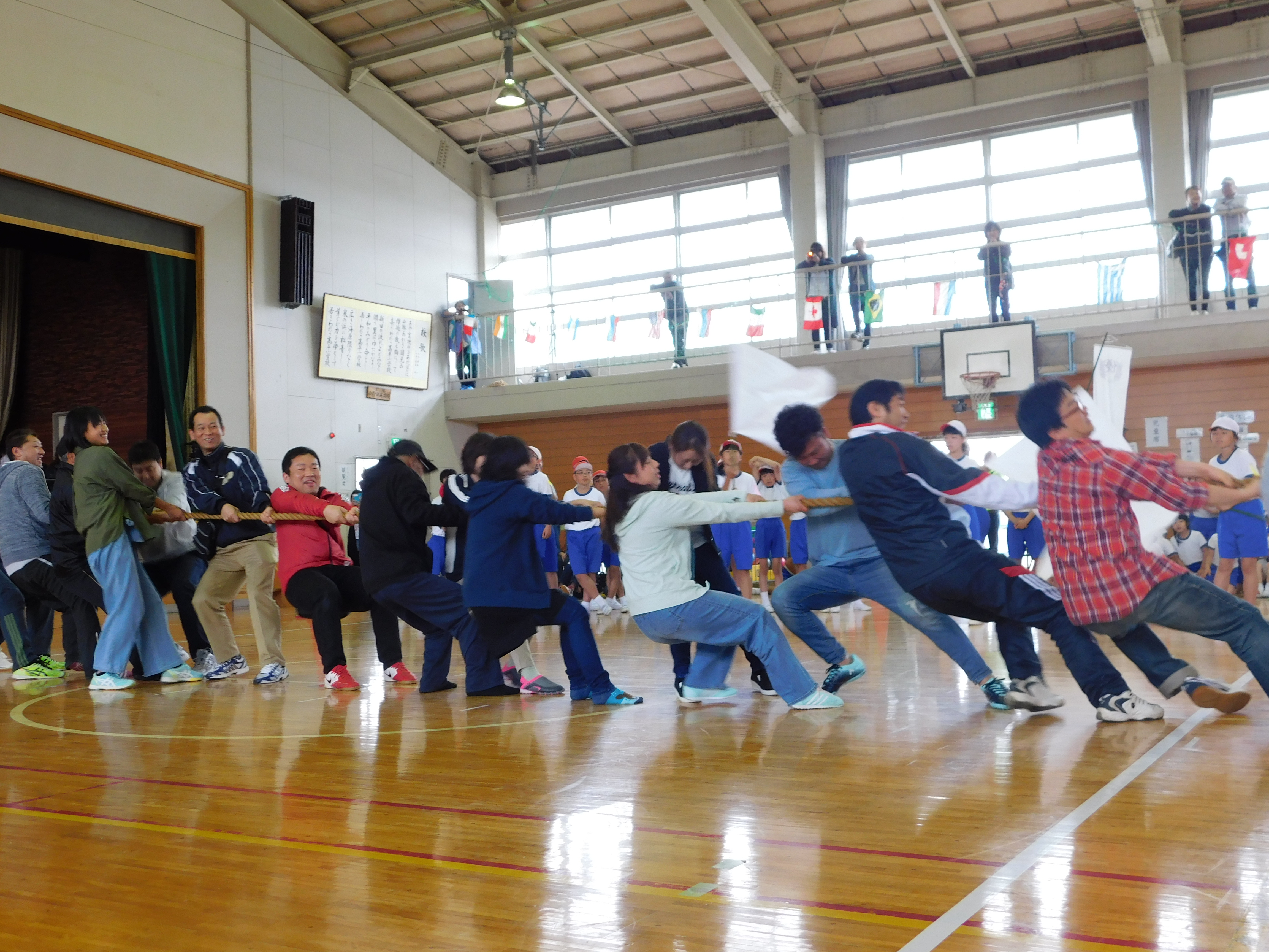 プログラム4番「PTA綱引き」では、前職員の片平教頭先生・尾形先生にも参加していただきました。1回目、2回目とも白組が力の強さを見せ、白組の勝ちでした。