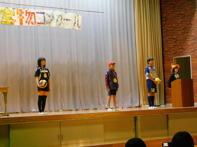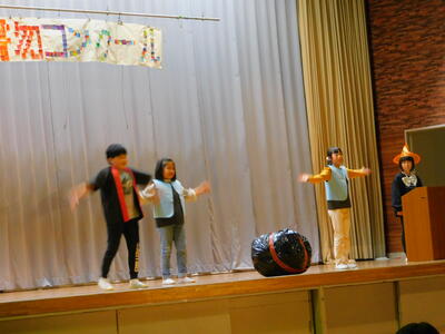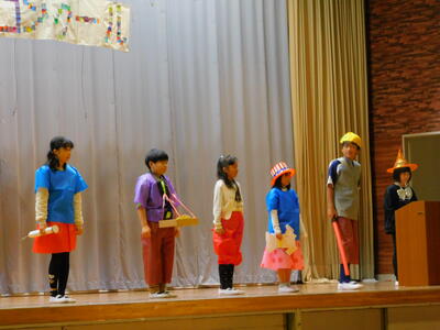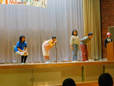 4年生は,劇「本当の宝物」でした。世界宝物コンクールが開かれ,世界中から一番の宝物を持ってきて行われるコンテスト。ところが,盗んだダイヤやインチキなランプなど,宝物とは到底言えないものを持ってくる人も。そんな中で,世界の宝物は,「子ども」「お年寄り」など本当の宝物が見つかります。「皆さんも,もう一度身近にある宝物を探してみてはいかがですか?」と最後に呼びかけました。校長先生の宝物は・・・。もちろん高平小学校の児童です。