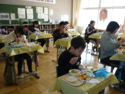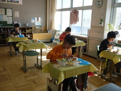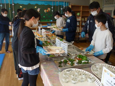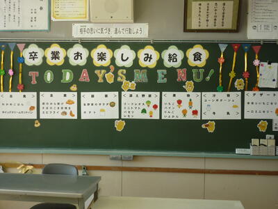 2022年2月18日 14時08分今日は,6年生が「卒業お楽しみ給食」でした。給食調理員の方々が,たくさんのメニューを考えて,調理していただきました。メニューの数が多かったので大変でしたが,卒業生の思い出になればと心を込めて作ってもらいました。調理員の方々に感謝の言葉を述べ,美味しそうに食べていました。いい思い出になりましたね。
