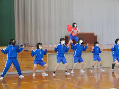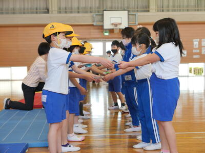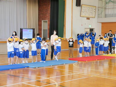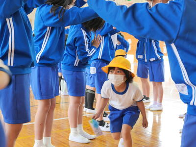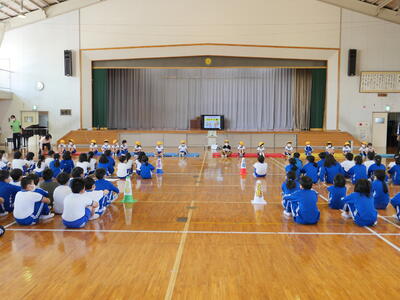 2023年4月20日 10時48分2校時に「1年生を迎える会」を行いました。6年生が会を進行して楽しい時間を過ごすことができました。児童代表のあいさつや学校紹介,〇✕クイズで,そして「エビカニクス」のダンスも踊りました。2年生からはプレゼントもあり,とっても喜んでいました。みんな仲良くできるといいですね!