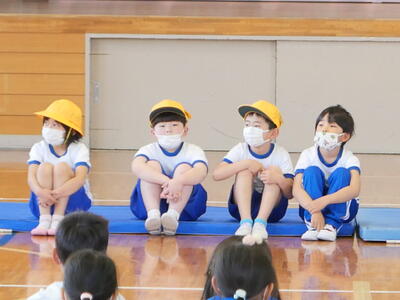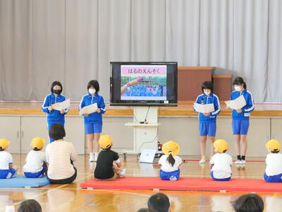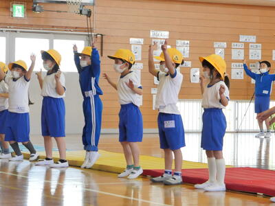2校時に「1年生を迎える会」を行いました。6年生が会を進行して楽しい時間を過ごすことができました。児童代表のあいさつや学校紹介,〇✕クイズで,そして「エビカニクス」のダンスも踊りました。2年生からはプレゼントもあり,とっても喜んでいました。みんな仲良くできるといいですね!