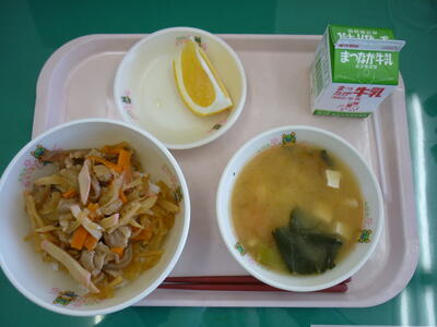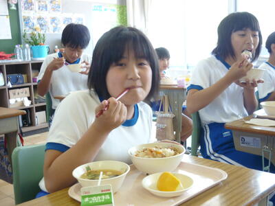 2023年5月11日 12時25分本日の給食は,『運動会おうえん献立』で,毎日,運動会に向けて練習をがんばっている児童に皆さんを応援する給食でした。献立は,とんトンびょうし丼,えのきいりみそしる。みしょうかん,牛乳でした。とんトンびょうし丼には,豚肉がたくさん入っていて,筋肉のもとになるタンパク質と疲れをとってくれるビタミンB1が入っています。玉ねぎは,ビタミンB1の体への吸収を高め,エネルギーに変える働きがあります。デザートの美生柑(みしょうかん)のビタミンCは,タンパク質を吸収しやすくして筋肉をたくましくしてくれます。今日の献立で,運動会がんばれそうですね。調理員の方々に感謝しながら食べましょう。