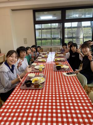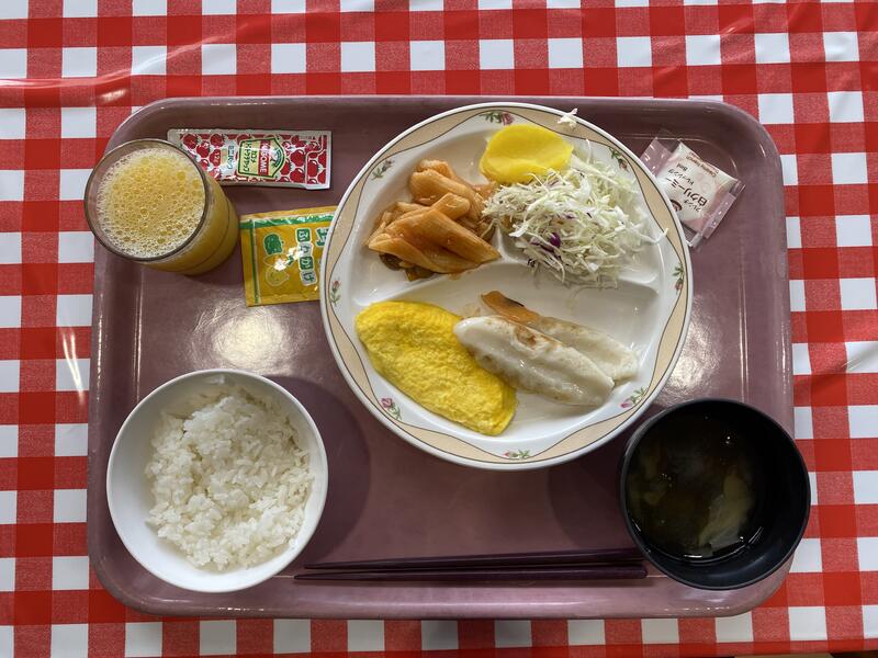 朝ご飯は「笹かま(だしあんかけ)」「オムレツ」「野菜とビーンズのトマト煮」です。しっかり食べて今日の活動に備えます。