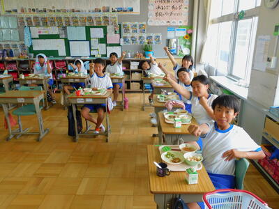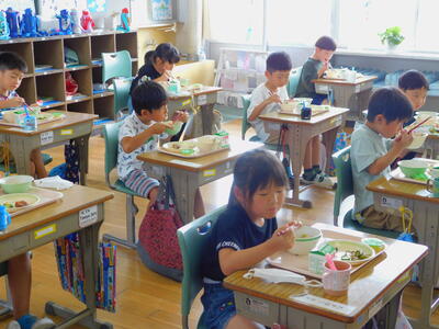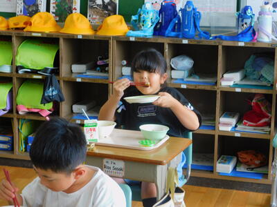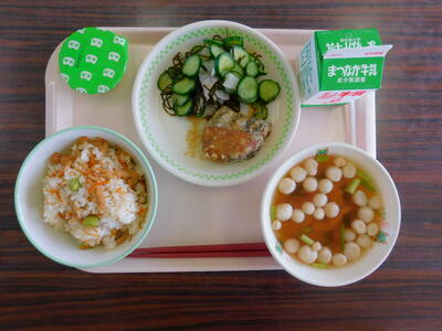 2023年7月18日 12時29分今日は,相馬野馬追の行事食「いざ出陣!献立」でした。貝柱のご飯,かつおの揚げ煮,きゅうりの昆布漬け,すまし汁,一口りんごコンポート,牛乳の献立でした。とくに「かつおの揚げ煮」は,浜通り地方の郷土料理で,相馬野馬追の時期に縁起を担ごうと「戦に勝つ」として,かつおを食べる習慣があったそうです。栄養満点のかつおを食べて,暑い夏を乗り切りましょう。