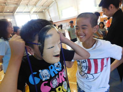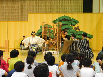能では、福島県の安達原に伝わる伝説の「黒塚」を見せていただきました。先日のワークショップで教わった技法も使われており、より楽しめる内容になっていました。また、能の終わりと同時に全校生で「千秋楽」を歌いました。練習の甲斐もあり「上手に歌えました。」とお褒めの言葉をいただきました。