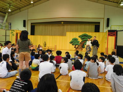 はじめの演目は狂言の「柿山伏」でした。狂言は喜劇ということもあって、子どもたちは狂言師の迫力ある演技に笑顔を浮かべながら狂言を楽しんでいました。