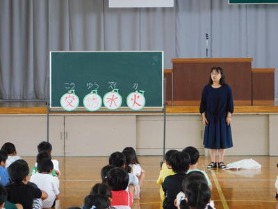 終業式の後には、生徒指導の先生と一緒に夏休みの過ごし方について「こうゆうスイカ(交・誘・水・火)」の合い言葉で確認しました。