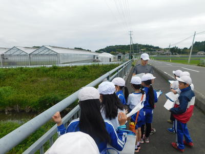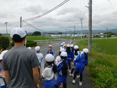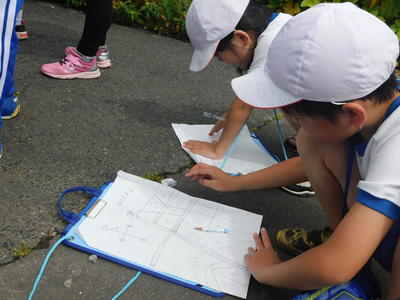 事前に書いておいた地図と実際の道を見比べながら、ゆっくりと歩いていきました。途中のお店や橋などの目印を見つけ、現在地を確認しながら歩く3年生達は、自分たちの学習の成果が確実に得られているようで満足そうにしていました。