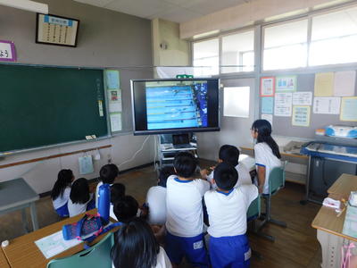 児童は事前に地図で見たり、校外学習で実際に歩いたりして確認した高平地区を空から見られる貴重な機会に胸を躍らせているようでした。映像がテレビに映されると、子ども達は食い入るように画面に集中し、意欲的に学習に取り組むことができました。