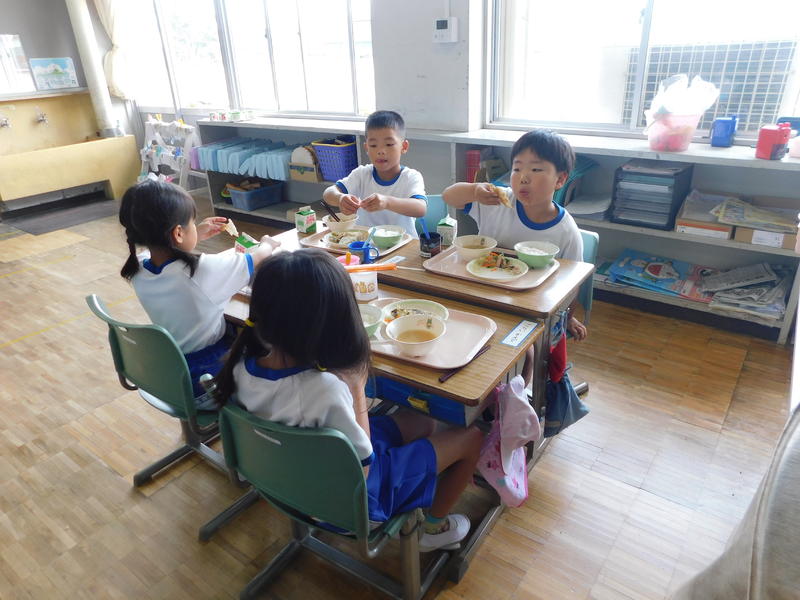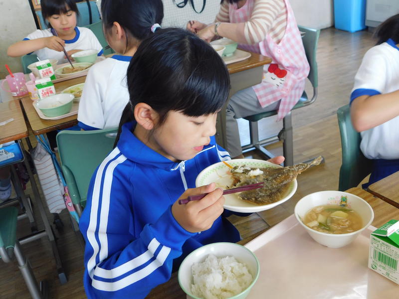 6月25日(火)の給食は、ごはん、小がれいの唐揚げ、野菜のさっぱり和え、豆腐と絹さやのみそ汁、そして牛乳、でした。中でも小がれいの唐揚げは、名前こそ小ですが、子どもたちにとっては丸々と大きく、カラッと油で揚げられた中身は、香ばしくボリューム満点でした。尾びれ、背びれ周辺のエンガワの部分は、小骨も柔らかく、でも堅い部分も有り、子どもたちは手づかみでカレイをつまみ、口の中で小骨を食べるか残すか噛み分けながら食事を取ることができました。どのクラスからも「おいしい」「おいしい」という声が聞かれました。カルシウム摂取の面からも、よい食材だと思います。