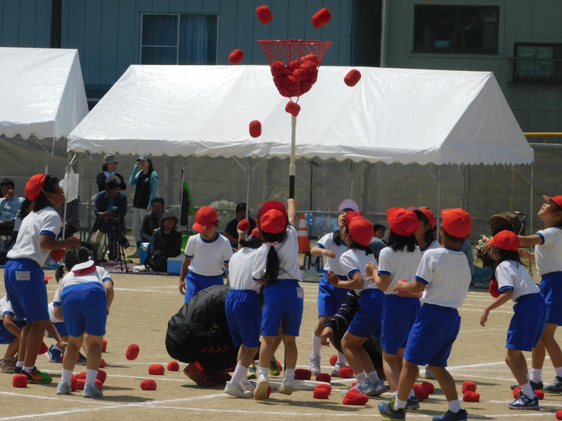 午前中は個人種目のかけっこやチャンスレースがメインで行われました。どの児童も一生懸命にゴールをめざし、練習の成果を発揮することができました。そのほかにも、紅白玉入れや綱引きも行われ、勝利に向かってがんばることができました。