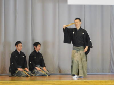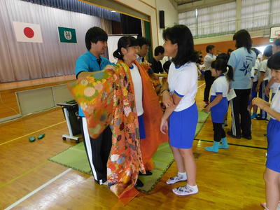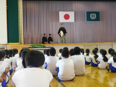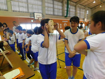 6月3日(月)、文化芸術子ども育成事業として能楽ワークショップが行われました。本校では、7月10日(水)に能楽の本公演を見せていただくことになっています。ワークショップでは、本公演をより楽しむために能や狂言の体験やクイズ、能楽堂の映像などで能楽について学ぶことができました。能と狂言の表現を実際にやってみたり、能面・能装束の体験をしたり、千秋楽を歌ってみたりと初めてのことばかりでしたが、能楽に触れる貴重な機会を楽しむことができました。本公演は保護者の皆様にもご案内いたしますので、ぜひいらしてください。